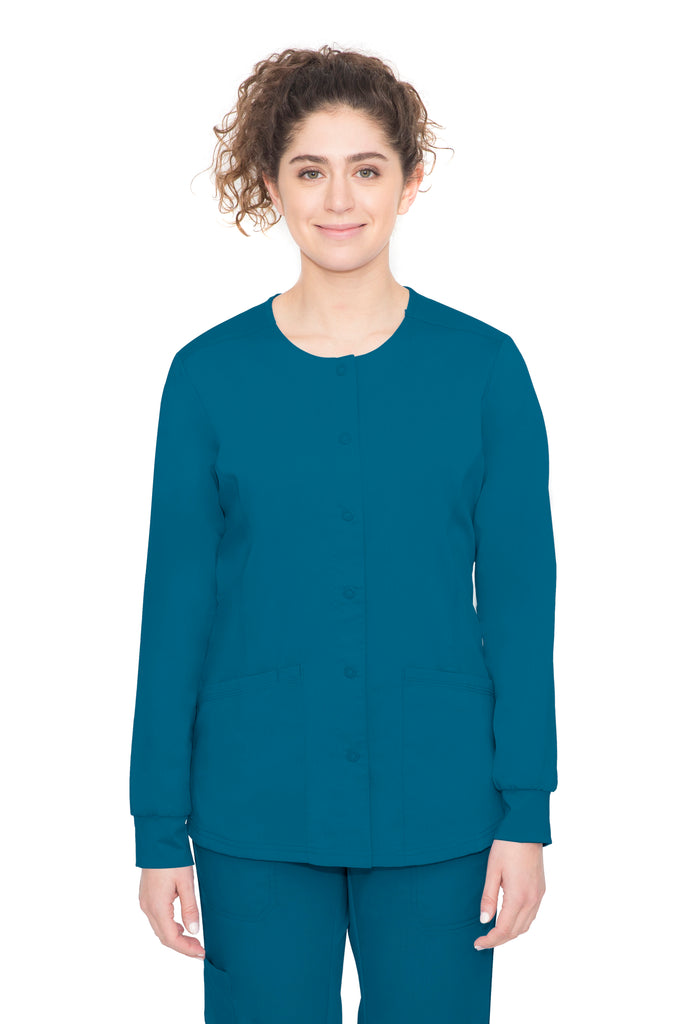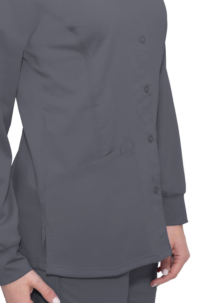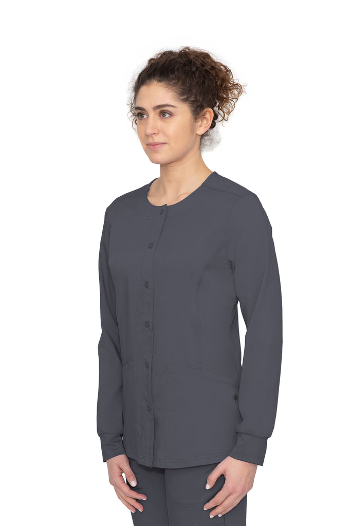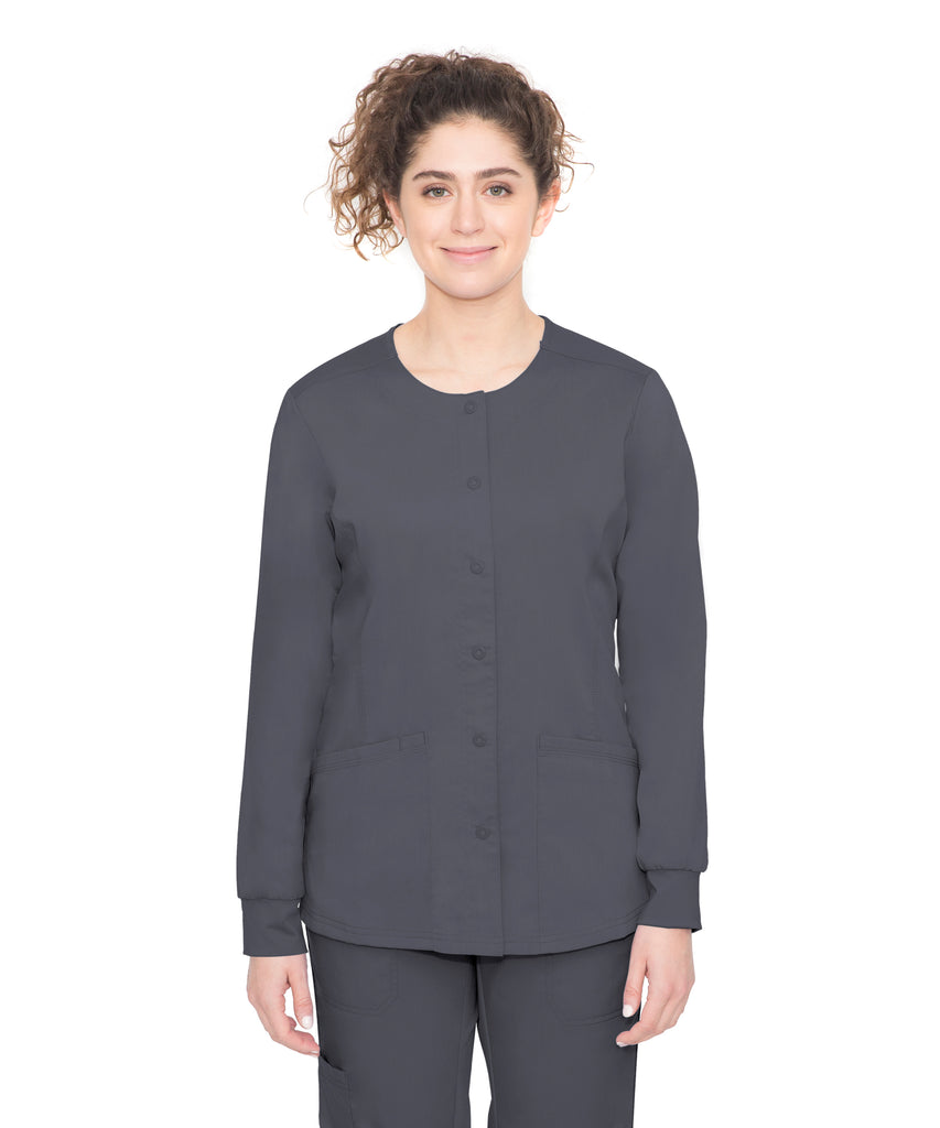 Daisy Snap Front Jacket features a round neckline with a front yoke. For an added fit, you will find front and back princess seams. For storage, there are four pockets: one double front patch pocket, one patch pocket, and one inner cell phone pocket. Side slits allow easy mobility. The stretch knit cuffs offer more flexibility. Made of 77% poly 20% rayon 3% spandex.