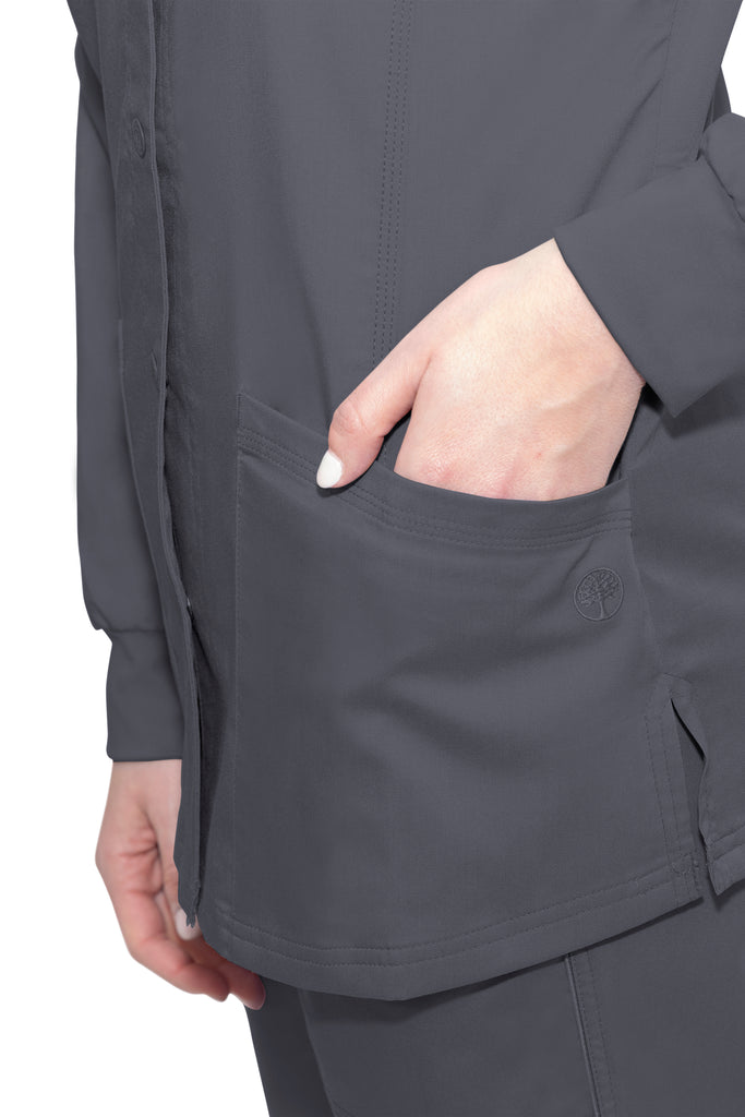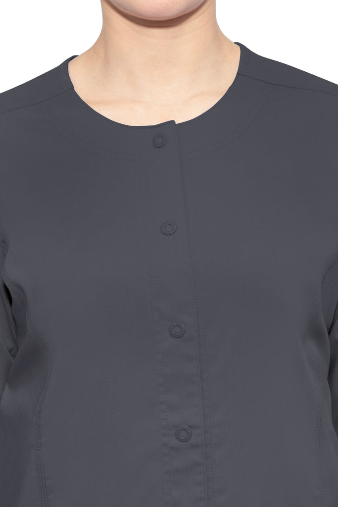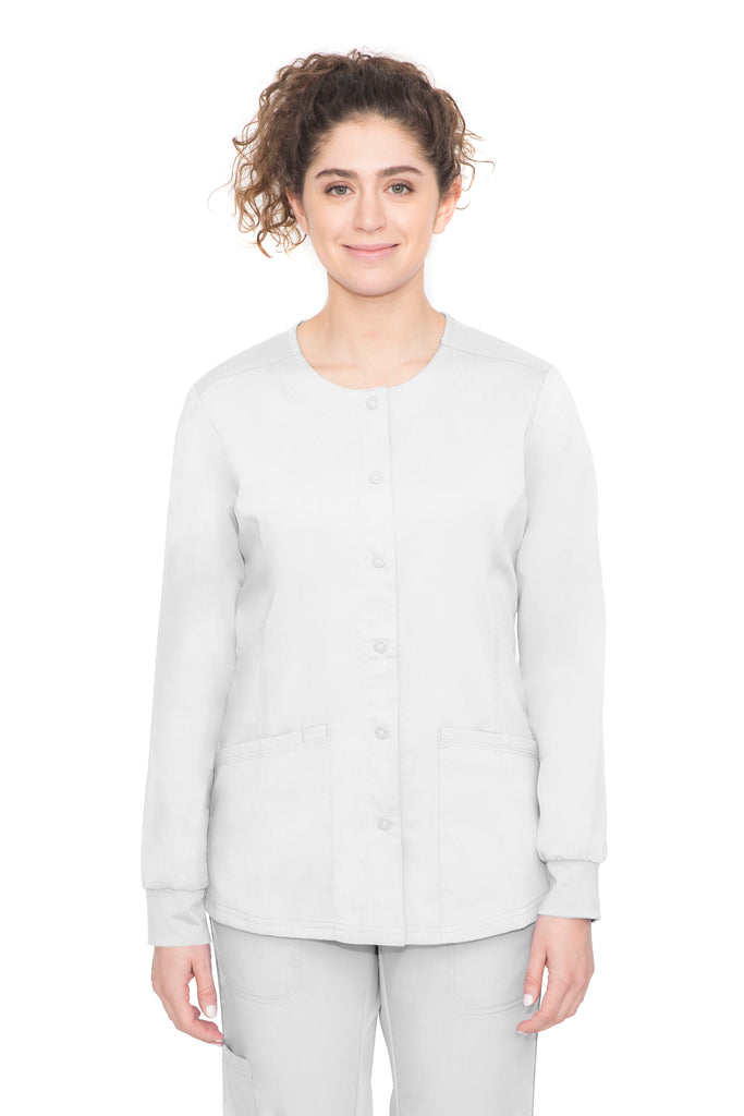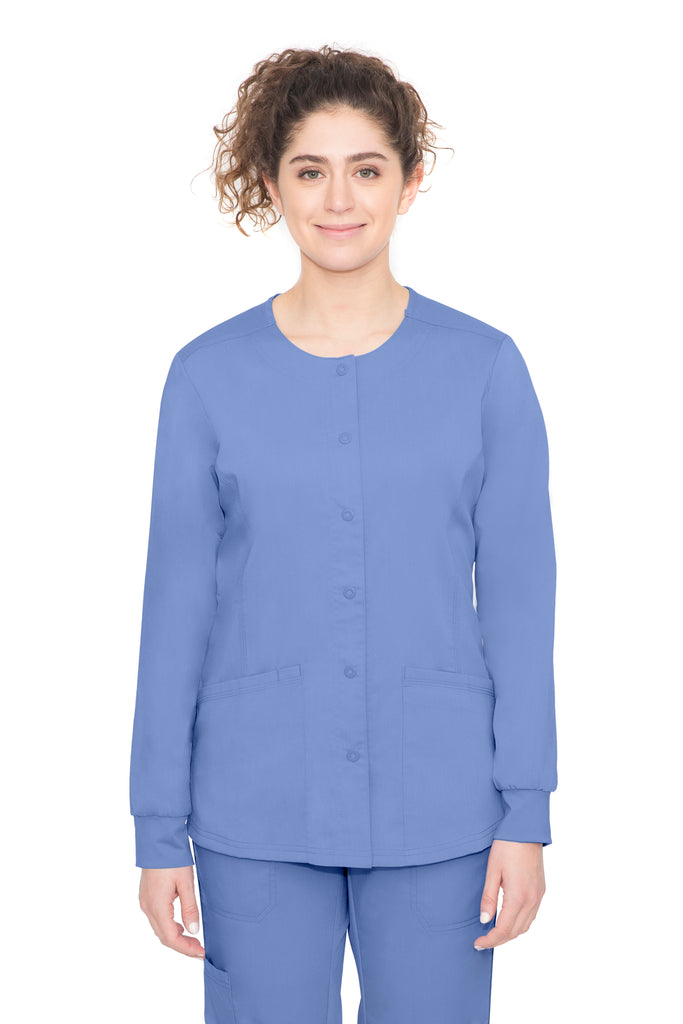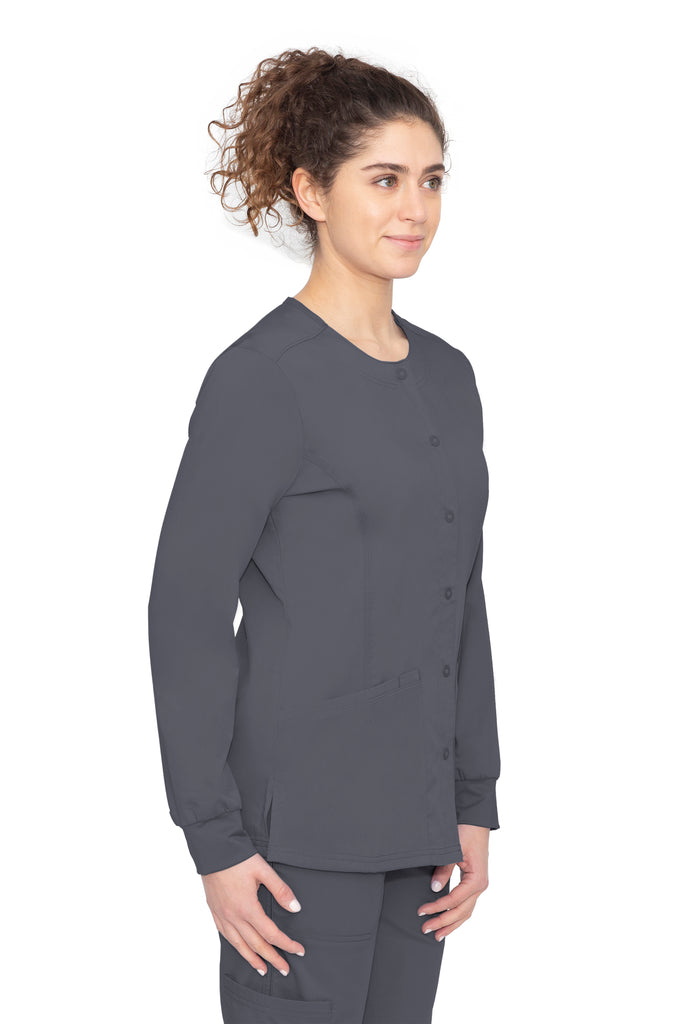 Daisy Snap Front Jacket features a round neckline with a front yoke. For an added fit, you will find front and back princess seams. For storage, there are four pockets: one double front patch pocket, one patch pocket, and one inner cell phone pocket. Side slits allow easy mobility. The stretch knit cuffs offer more flexibility. Made of 77% poly 20% rayon 3% spandex.